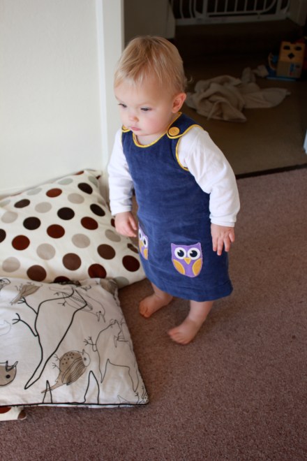 Poppy’s Godmother Bron, sent this dress to her for her birthday from the UK. What perfect colour combinations – purple, yellow and blue corduroy!